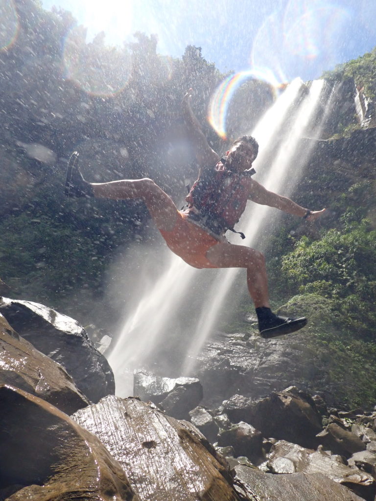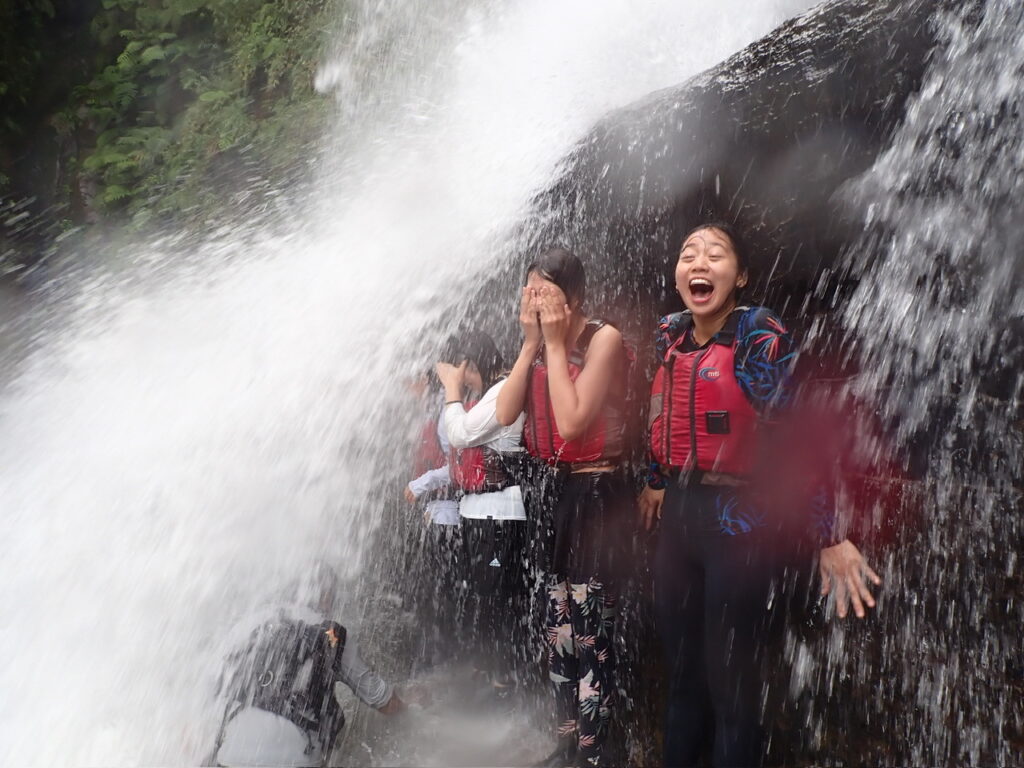 カヤックを片道1時間半~2時間がっつり漕ぐコースです。がっつり漕いで30分ほど歩いた先にあるナーラの滝は、でっかい滝壺で飛び込んだり泳いだり、滝の裏側に入ることもできちゃいます。