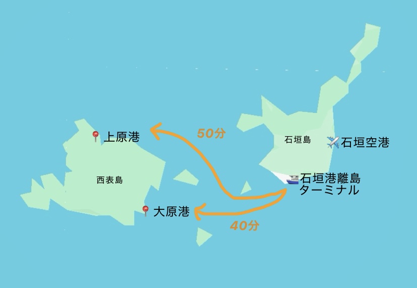 西表島には「大原港」と「上原港」と2つの港があり、それぞれ島の反対側に位置しています。とても大きな島なので乗り間違えると大変、、どころかすべての予定がパーになる可能性もあるので要注意です。