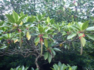 最近オヒルギの種が増えてきました。胎性種子と言ってこの細長いのがそのまま種なんですよ。もうじき落ちて、川をプカプカ流れていくはずです(^^)
