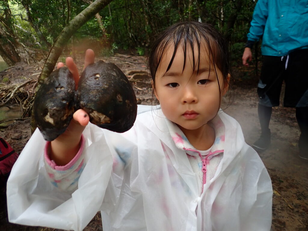 カヌーを降りたところにシレナシジミの殻を発見!4歳の娘ちゃんが持つとさらに大きい!