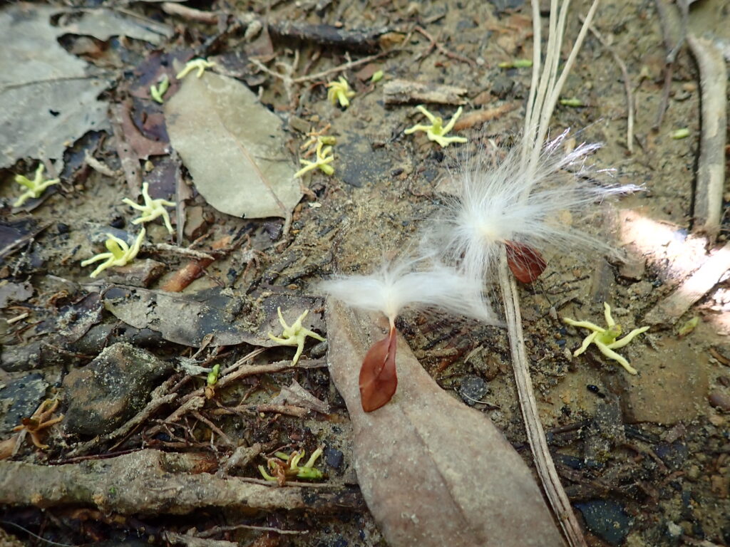 こちらは最近よく見かける綿毛、サカキカズラの種です。隣に落ちている手裏剣みたいのがお花。西表島は冬でも緑のジャングルですが、季節は確実に移ろっています^^